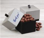 When your recipients pull the grosgrain tab to lift the lid of these unassuming boxes, they'll be delighted by what is revealed! We foil-stamp your logo in your choice of color on the side of the silver lid, then fill it with our famous chocolate covered almonds, five-ounces. The charming box is handy for storing small items long after the treats have been enjoyed, providing a lasting reminder of your regard.